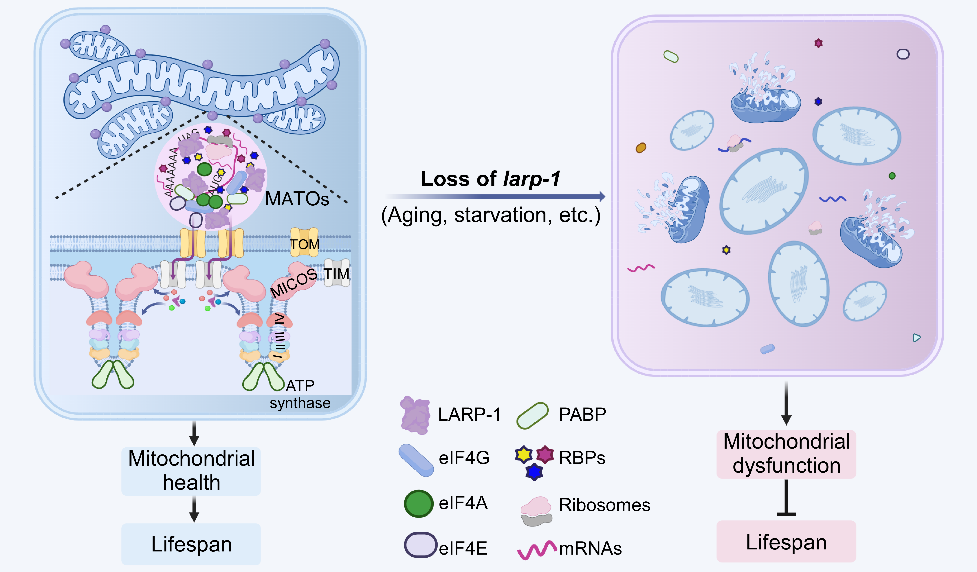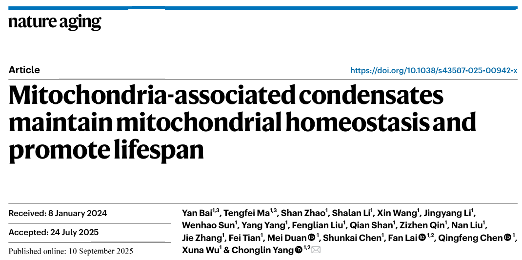 2025年9月10日,云南老员工命科学研究中心杨崇林研究团队,在自然衰老期刊Nature aging 上发表了题为: Mitochondria-associated condensates maintain mitochondrial homeostasis and promote lifespan 的研究成果。该研究直接揭示线粒体上的蛋白凝聚体作为蛋白质翻译的场所“码头(mitochondria-associated translation organelles, MATOs )”, 原位合成线粒体蛋白,“码头”与TOM 复合物互作,共翻译转运进入线粒体,维持其结构和功能。在胁迫和衰老条件下,“码头”会解聚,线粒体结构和功能随之破坏。反之,锚定在线粒体上的“码头”可以维持胁迫或衰老过程中的线粒体健康,延长机体寿命。