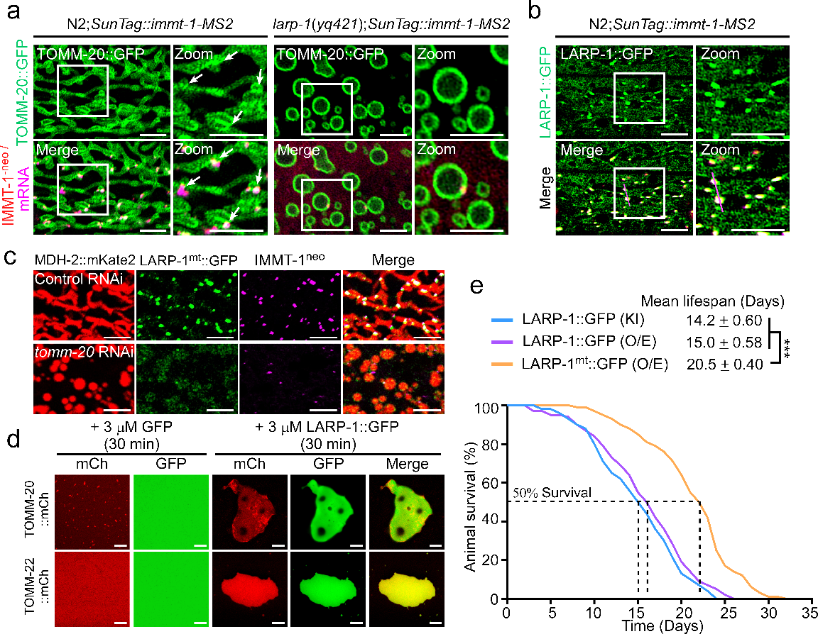 图2. SunTag-scFv和MS2-MCP系统可视化LARP-1介导的IMMT-1/ATP-2局部翻译过程(a);IMMT-1/ATP-2的mRNA和新生多肽与“码头”共定位(b);对TOM 复合物组分的 RNAi 处理显著减少了 “码头”的数量,破坏了线粒体的结构(c);TOM 复合物组分能够被分选至LARP-1 蛋白凝聚体中(d);“码头”锚定在线粒体上时,显著延长线虫的寿命(e)。