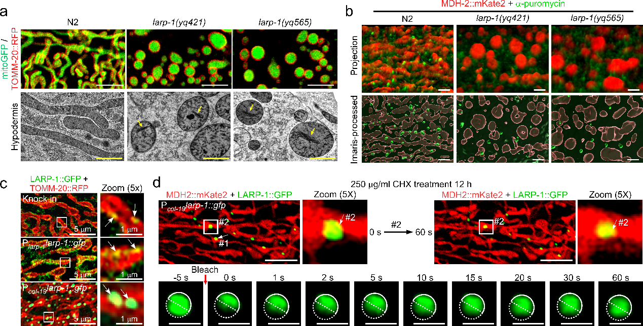 图1. larp-1突变体,成虫表皮细胞线粒体呈球状异常结构,并伴随嵴结构破坏(a);LARP-1 依赖性的蛋白质合成发生在线粒体表面(b);LARP-1在体内,以浓度依赖的方式驱动液-液相分离(LLPS)(c),在线粒体上形成具有内部流动性的凝聚体(d)。