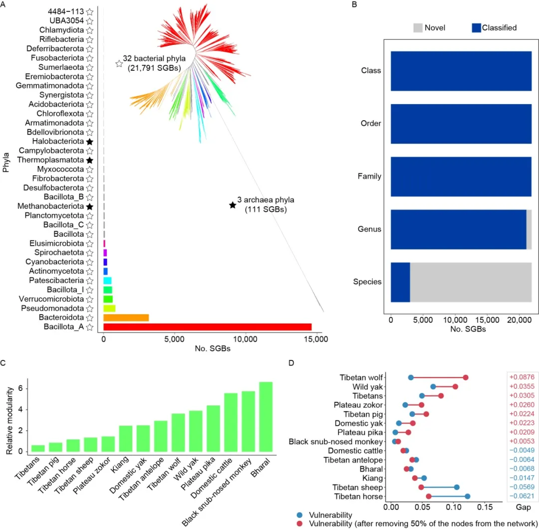 通过宏基因组组装、严格的分箱与质量控制,研究者共重建112,313个宏基因组组装的基因组(MAG),并聚类为21,902个物种水平基因组单元(SGB);其中86%的SGB在现有数据库中未被注释,表明青藏高原哺乳动物肠道微生物包含大量未被识别的物种资源。