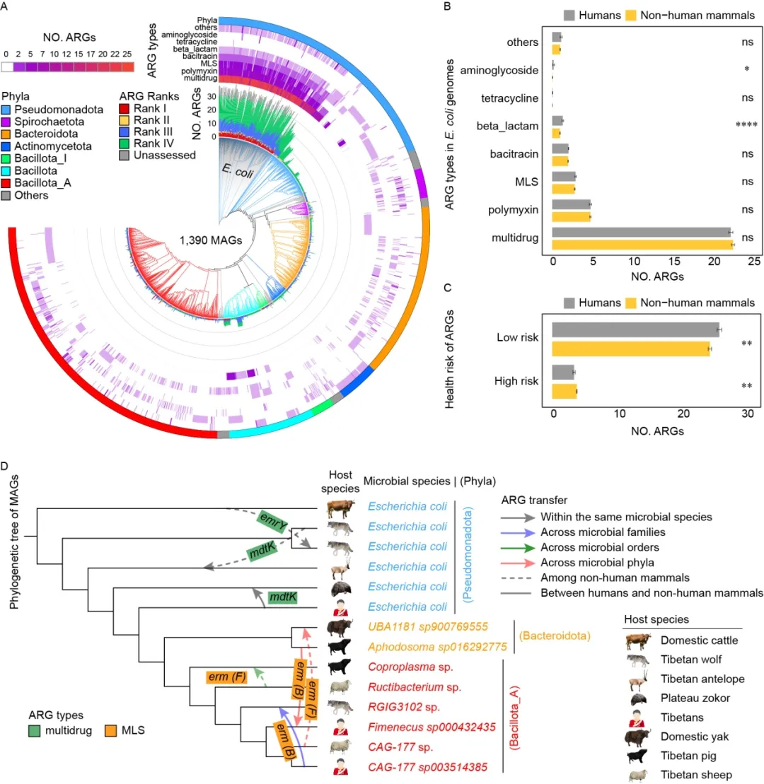 通过对高质量测序片段进行抗生素抗性基因(ARG)注释,研究人员共识别8,598个非冗余ARG,涵盖28类耐药类型。研究人员进一步采用ARG风险分类方法鉴定了334个高风险ARG,并在536个携带高风险ARG的微生物基因组中预测到2,843次水平基因转移事件,其中7次涉及高风险ARG跨物种水平转移,且3次发生在人与非人类哺乳动物之间。此外,大肠杆菌被鉴定为主要的ARG宿主之一,其基因组通常携带多种耐药基因。研究还发现,青藏高原人群的肠道ARG的丰度和高风险ARG的丰富度普遍高于来自低海拔地区的人群,而青藏高原家畜的ARG丰度则低于其他地区的家畜,提示抗性基因分布受多种区域性驱动因子影响。