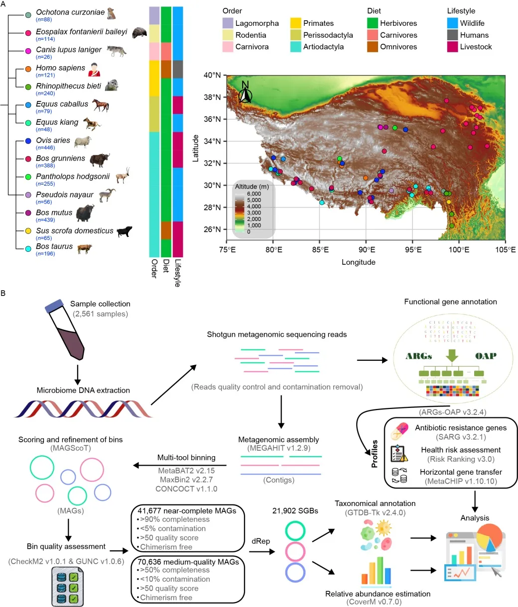 研究团队在2016–2022年间采集了2,561份来自14种哺乳动物(涵盖人类、家畜和野生动物)的肠道宏基因组样本。系统构建了青藏高原哺乳动物肠道微生物组的基因组目录。