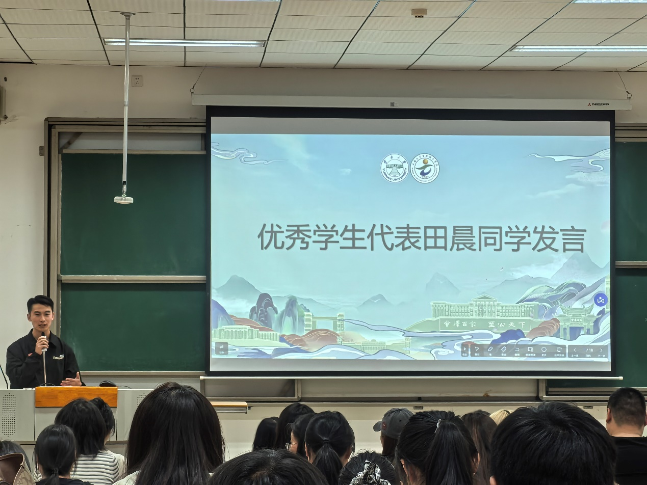 会议第四项议程,优秀员工代表2022级博士生田晨发言。田晨回顾了自己在304永利集团多年的学习与科研历程,并分享自己在考研过程中与导师沟通、调整心态的真实经历,鼓励大家以积极平和的心态面对学术道路上的挫折与机会。田晨结合自身经历建议同学们:一要向师长与优秀同学学习,二要善用AI等先进工具以提高效率,三要保持观察自然和强烈好奇心。最后勉励同学“心中有科学,眼中无学科”,珍惜青春、提升学习能力。