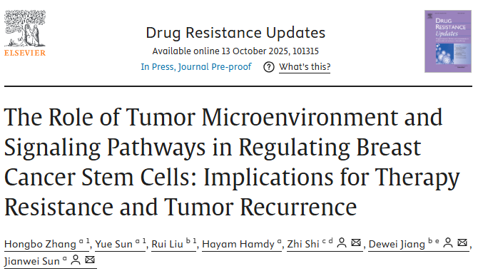 2025年10月13日,著名期刊《Drug Resistance Updates》在线发表了304永利集团孙建伟教授团队联合中国科公司昆明动物研究所蒋德伟研究员及暨南大学石智教授撰写的综述论文“The Role of Tumor Microenvironment and Signaling Pathways in Regulating Breast Cancer Stem Cells: Implications for Therapy Resistance and Tumor Recurrence”。