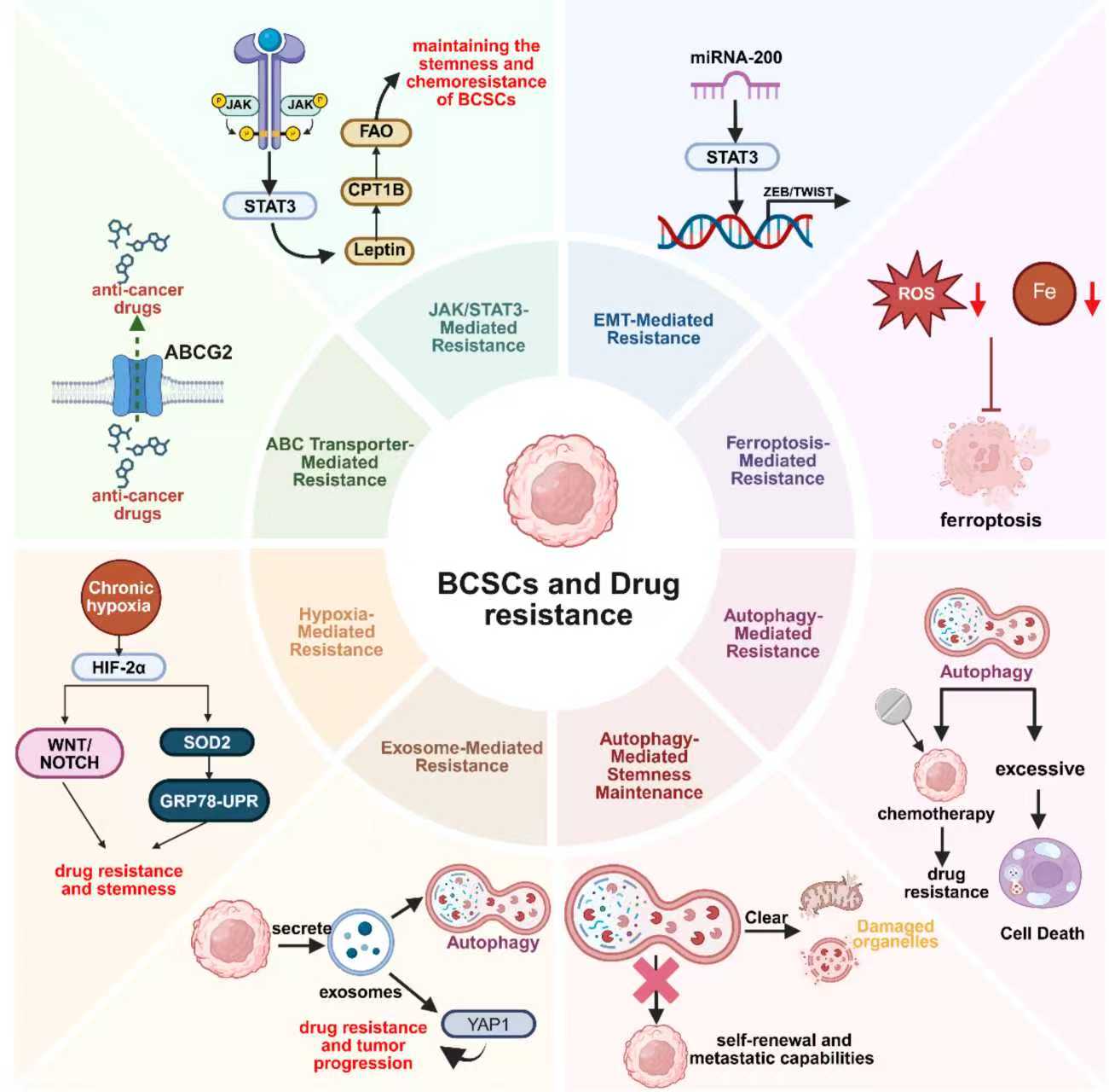 乳腺癌干细胞(BCSCs)具有自我更新和多向分化能力,是肿瘤发生、进展和复发的关键因素,也是临床治疗的重要障碍。该论文围绕近年来BCSCs的研究进展,重点综述了BCSCs在肿瘤复发、转移和耐药中的核心作用,并深入分析了信号通路与肿瘤微环境(TME)之间的协同调控机制。BCSCs通过Notch、PI3K/AKT/mTOR、JAK/STAT3等信号通路,维持其干性,并促进肿瘤细胞的侵袭性和生存能力。同时,肿瘤微环境中的低氧、细胞因子、癌相关成纤维细胞及免疫细胞等因素,协同作用支持肿瘤干细胞的存活、转化及免疫逃逸,从而促进肿瘤的生长、转移及耐药性。综述还总结了BCSCs的主要标志物,如CD44、CD133等,并介绍了上皮-间质转化、自噬、铁死亡及外泌体介导的耐药机制及相互作用。在治疗层面,靶向干细胞标志物、关键信号通路和肿瘤免疫微环境能够有效抑制BCSCs,例如PI3K/mTOR通路抑制剂、γ-分泌酶抑制剂和二甲双胍等药物在实验及临床研究中展现了逆转耐药和抑制干性的潜力,为乳腺癌的精准治疗和复发预防提供了新思路。