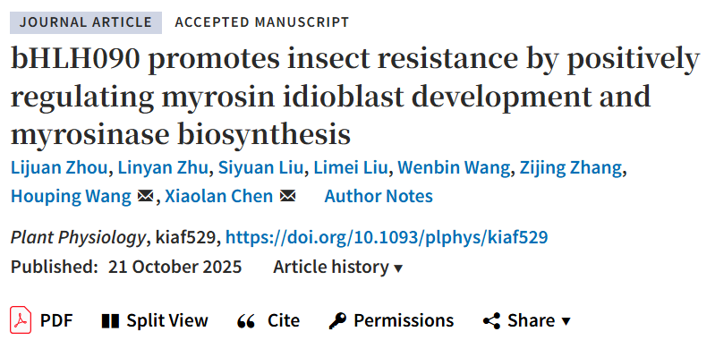 2025年10月21日,304永利集团陈小兰课题组与云南生物资源保护与利用国家重点实验室王后平研究组合作,在《Plant Physiology》发表了题为“bHLH090 promotes insect resistance by positively regulating myrosin idioblast development and myrosinase biosynthesis”的研究论文,揭示拟南芥转录因子 bHLH090通过调控黑芥子酶异细胞发育与黑芥子酶生物合成,增强抗虫性的分子机制。阐明 “FAMA–bHLH090–TGG1” 调控模块的功能,为十字花科作物抗虫育种提供重要理论依据与分子靶点。