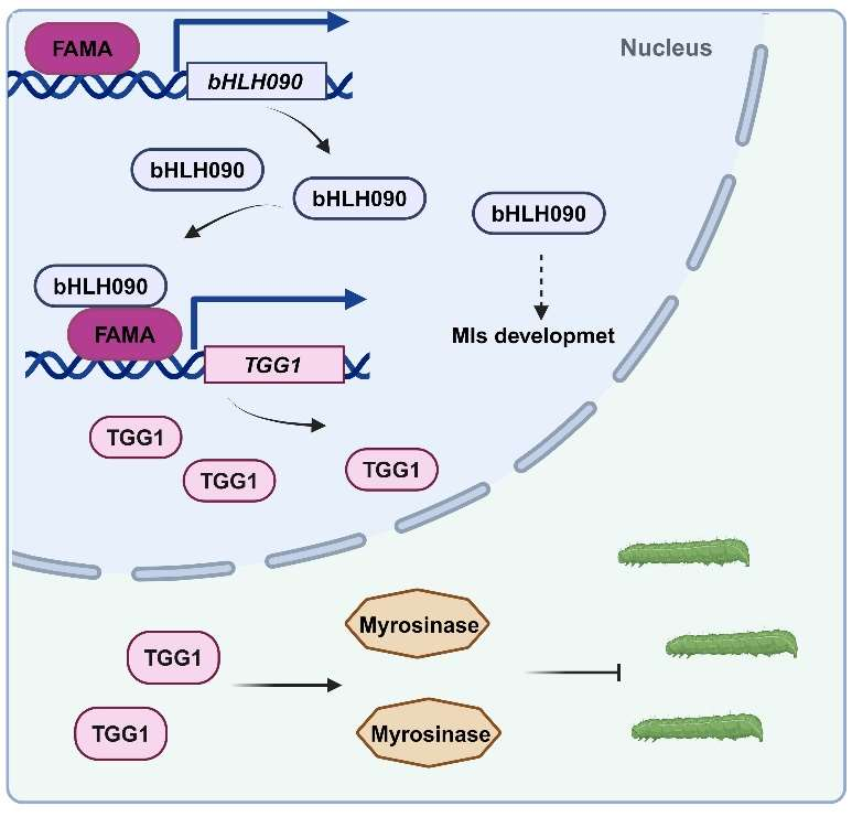 图1. FAMA-bHLH090-TGG1模块介导的抗虫机制模型