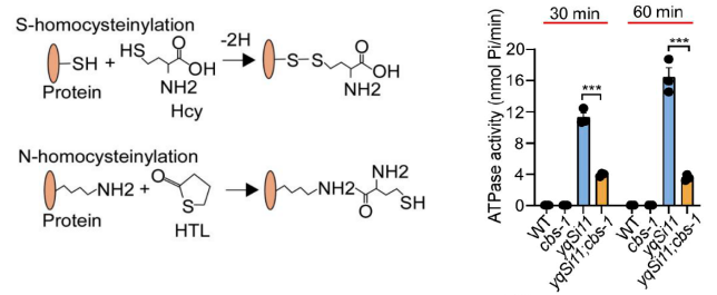 图2:同型半胱氨酸修饰示意图(左);V-ATPase活性受同型半胱氨酸修饰所抑制(右)。