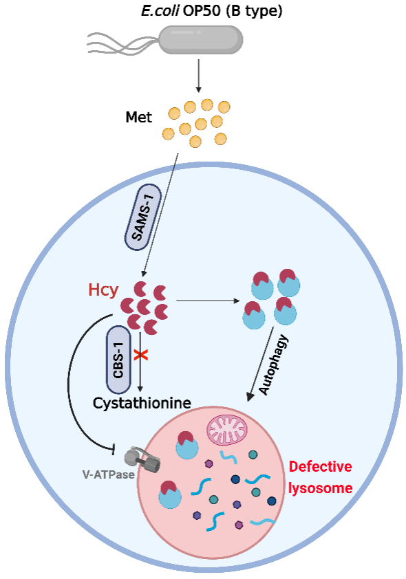 研究人员发现,秀丽隐杆线虫的cbs-1基因缺失会导致溶酶体异常增大和功能障碍,并伴随多种未消化底物的积聚及严重的膜损伤。结合遗传学分析、代谢物分析与膳食调控实验,证实cbs-1缺失引起的同型半胱氨酸异常积累是导致线虫溶酶体功能障碍与发育缺陷的直接原因。