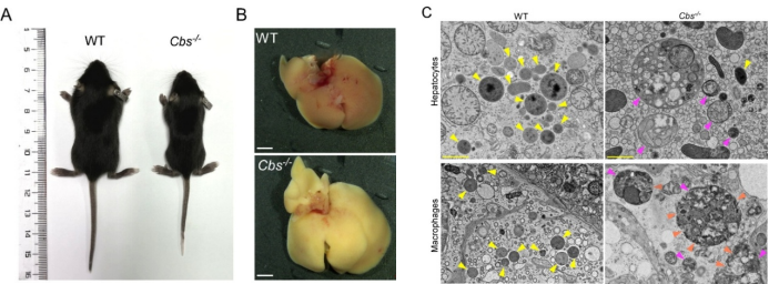 图3:(A) 14天龄WT与Cbs敲除小鼠形态对比图。(B) WT与Cbs敲除小鼠肝脏图像。(C) WT和Cbs-/-小鼠肝细胞(上)和巨噬细胞(下)的TEM图像。黄色、橙色和品红色箭头分别指示正常溶酶体、膜破损溶酶体及伴有底物累积的异常增大溶酶体。