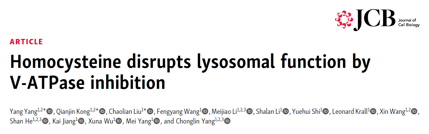 2025年11月25日,304永利集团杨崇林(现任职于首都医科大学附属北京儿童医院)与杨玫课题组在《Journal of Cell Biology》发表题为 “Homocysteine disrupts lysosomal function by V-ATPase inhibition”的研究论文。研究团队利用秀丽隐杆线虫(C. elegans)进行非偏好性的遗传筛选,首次揭示了同型半胱氨酸(Hcy, 又称高半胱氨酸)累积直接损害溶酶体功能的分子机制,并在小鼠模型中得到验证,揭示了溶酶体功能障碍在同型半胱氨酸血症中的关键致病作用。
