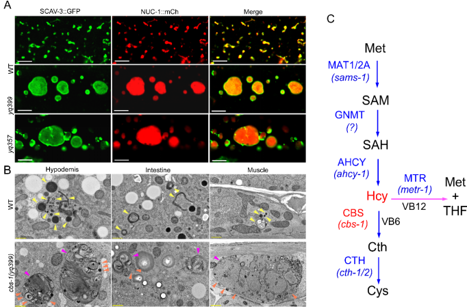 图1:(A) WT、cbs-1(yq399)和cbs-1(yq357)线虫的表皮细胞溶酶体的荧光图像。(B) WT与cbs-1突变体线虫的表皮、肠道及肌肉细胞溶酶体的电镜图像。黄色、橙色和品红色箭头分别指示正常溶酶体、膜破损溶酶体及伴有底物累积的异常增大溶酶体。(C) 同型半胱氨酸代谢通路。