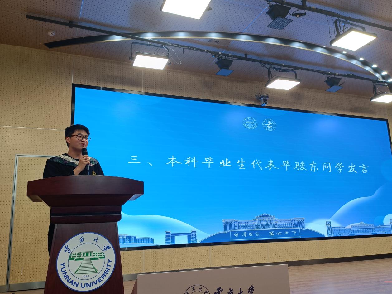 2020级本科生毕骏东作为本科毕业生代表发言。回顾本科学习的经历,他诚恳地感谢了公司老师和同学们所提供的鼓励、支持和热心帮助,分享自己充实、丰富的学习所获,也分享了对云大校园生活的热爱。他表示,将与同学们一起带着对生活的热爱,勇敢地去探索未知世界的无限可能,勇敢地去选择自己所热爱的事业,创造属于自己的无悔人生,做一个有理想、有担当的青年。