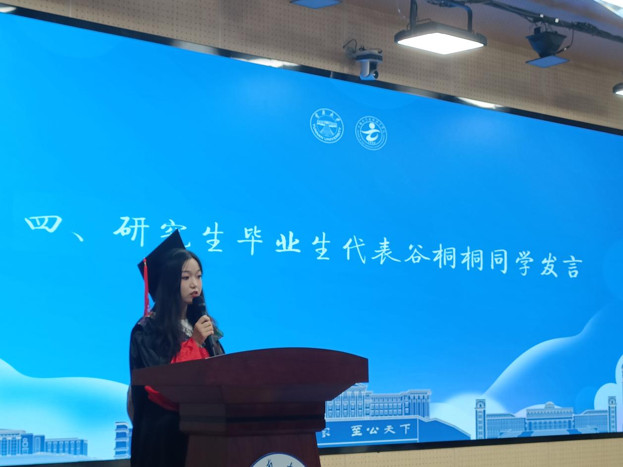 2021级博士研究生谷桐桐作为研究生毕业生代表发言。她回顾了求学过程中所历的迷茫和困惑,面对前方未知的道路时也曾感到彷徨不安,正是在老师、同学的引导与共勉下,才穿过挣扎与磨难,领悟到成长的真谛,“靡不有初,鲜克有终”。她表示,自己将以最饱满的热情和积极的态度去面对未来新的挑战,希望未来与大家一起奋勇直前、坚持不懈,奔赴下一片山海。
