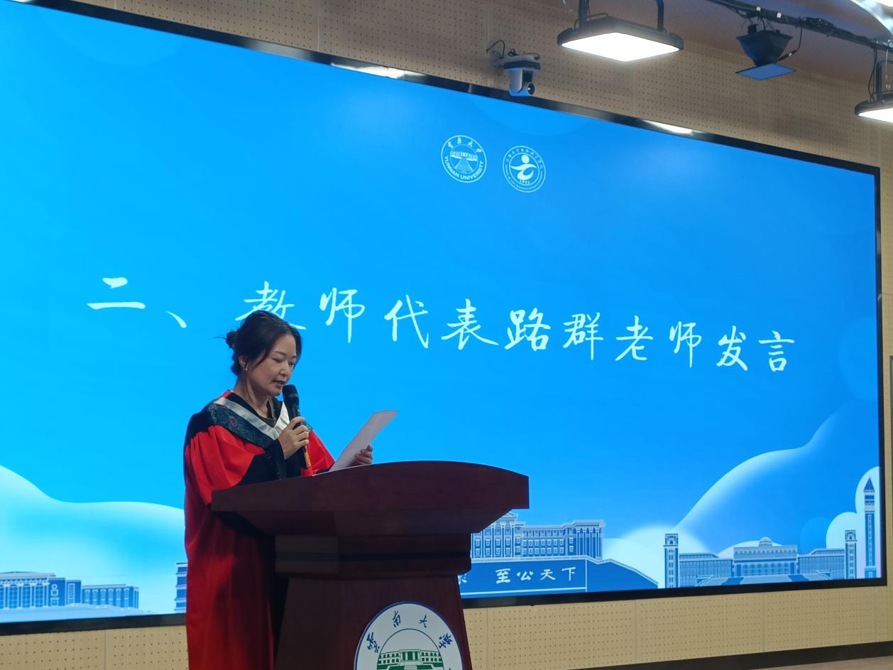 2020级本科生班主任路群教授作为教师代表发言。她希望全体毕业生要保持对知识的渴望,更好地面对以后的挑战;保有坚定的理想,一步一步向自己的目标努力;保持对生活和我们赖以生存的这个世界的热爱,在未来的道路中勇敢追梦,成为更好的自己;保有坚韧的毅力,踏实前行,用知识和独立思考能力武装自己,回报社会。